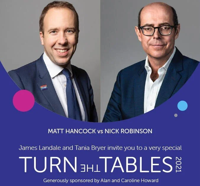 Inspired by the plight of hapless politicians harassed and castigated by journalists, Turn The Tables is an event from Cancer Research UK that gives politicians the chance to wreak revenge on their journalistic foes in front of a live audience. This event is returning for 2021 in a virtual format on the 15th March from 6.30pm. A year ago, Jacob Rees-Mogg joined the alumni of participants by coming straight from his COBRA meeting to tell everyone to wash their hands whilst singing happy birthday. So much has happened since then!! The global pandemic has put a huge strain on cancer services and hit Cancer Research UK’s fundraising hard. Cancer Research UK was forced to cut its research funding by £45m, which means dozens of potential life-saving projects won’t receive the funding needed to support their world-class research. But they will never stop working to make progress for people affected by cancer. This year for their virtual edition of Turn the Tables, they have just one very special interview planned, they announced today that participants this year will be Health Secretary Matt Hancock & BBC’s Nick Robinson. There will also be a small auction and an opportunity to ask the participants questions during “Cash for Questions”. Tickets are priced at £50 per household. To book your ticket, please register and pay here. You will be sent full information and a joining link to the event the week commencing 8th March. We can’t wait!